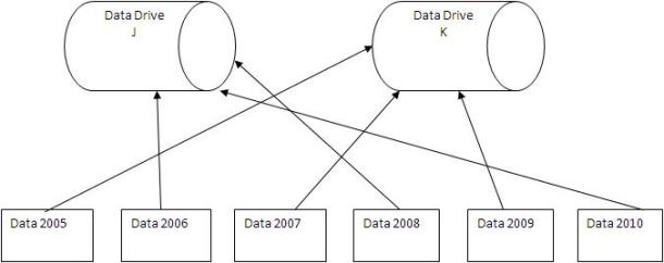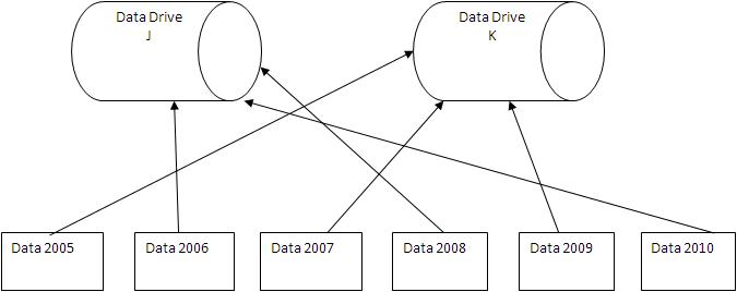 Tying this partitioning discussion back to the disks that we talked about previously, each partition (by way of file-group) is tied to a drive letter, which is one of the two data luns from the SAN.