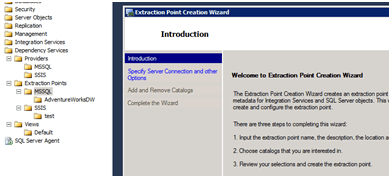 I have been on the “What’s New In CTP1 for Denali” speaking “tour” (if you count 2 as a tour) for the past week. What I can say from my interactions, and the feedback from the presentation, there is some real excitement for the new release (although dauntingly far away for some people). In my presentation I go over the “what’s new” for SSIS… and finish up with a look at the new dependency services piece. It is clearly the dependency services that has the BI folks hooked! To support the interest that people have expressed, I wanted to write a quick post to cover some of the dependency services parts, and get you rolling with what will be a very cool, very important part of the BI infrastructure in Denali.